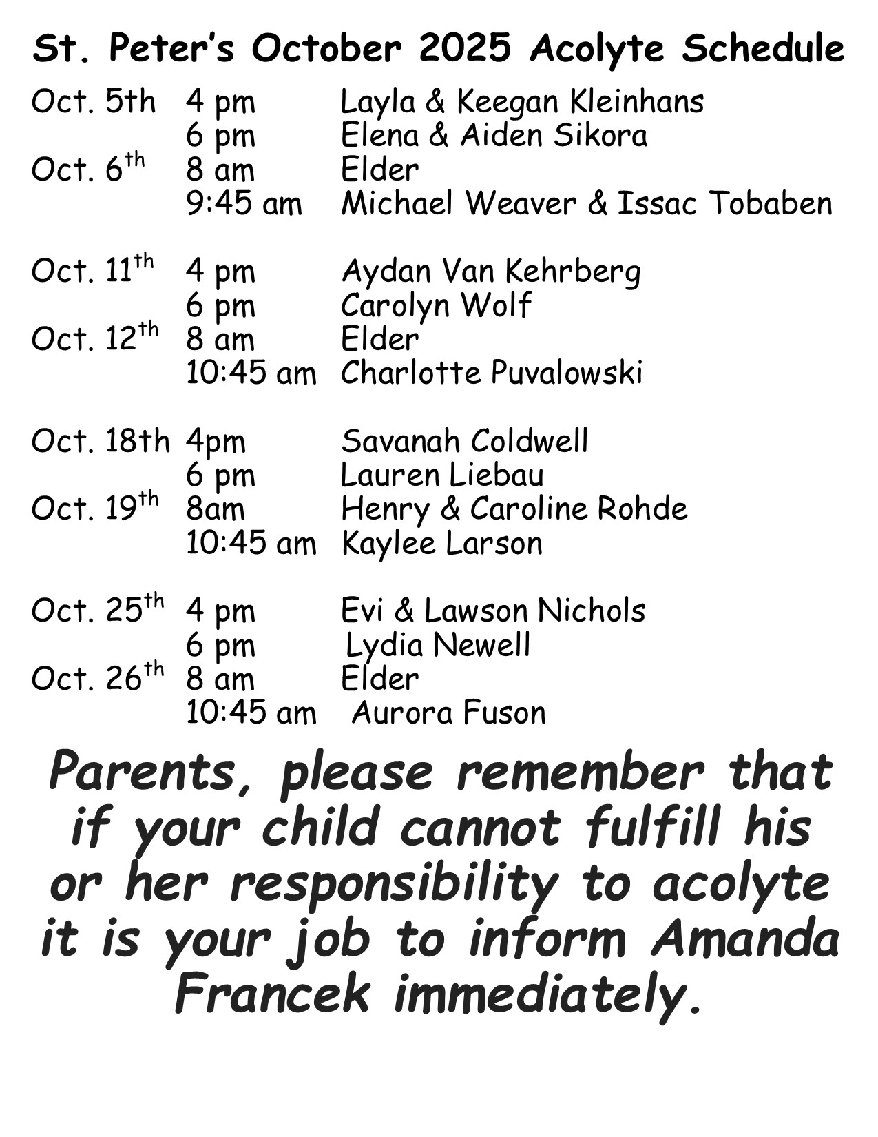 Parents, please remember that if your child cannot fulfill his or her responsibility to acolyte, it is your job to notify Amanda Francek.